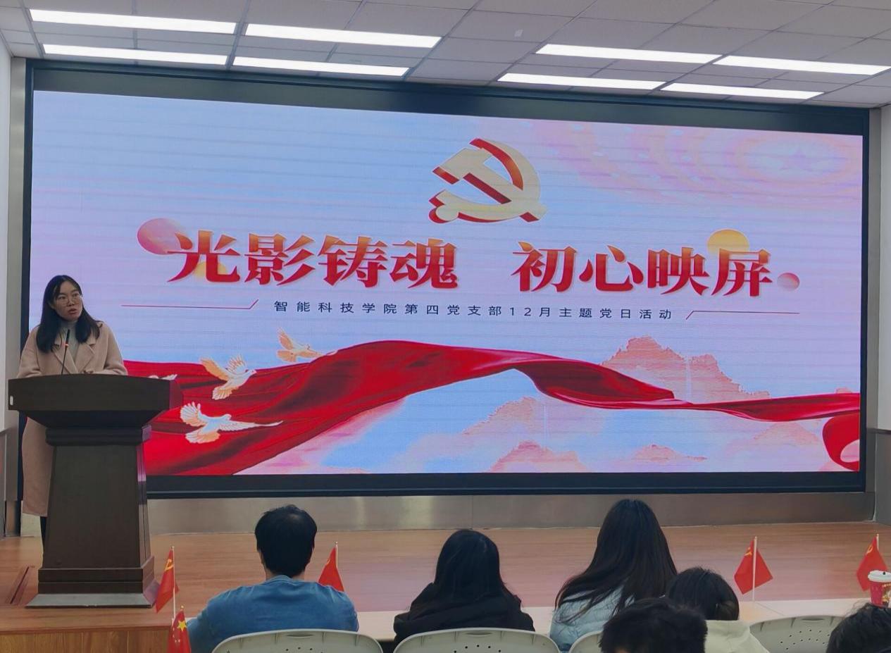 为深入学习贯彻党的创新理论,创新党组织活动形式,丰富党员教育载体,引导广大党员、青年学子从优秀影视作品中汲取精神力量、筑牢信仰根基,12月18日,智能科技学院第四党支部在实验楼110开展“光影铸魂,初心映屏”视频剪辑比赛的主题党日活动。本次活动由学院第四党支部宣传部干事陈智羽浩主持,学院第四党支部书记吴雪娇、宣传委员何旌铭、组织委员刘柯含,以及参加本次投稿的第四党支部同学参加,大家齐聚一堂共同走进一场思想与视觉交织、...