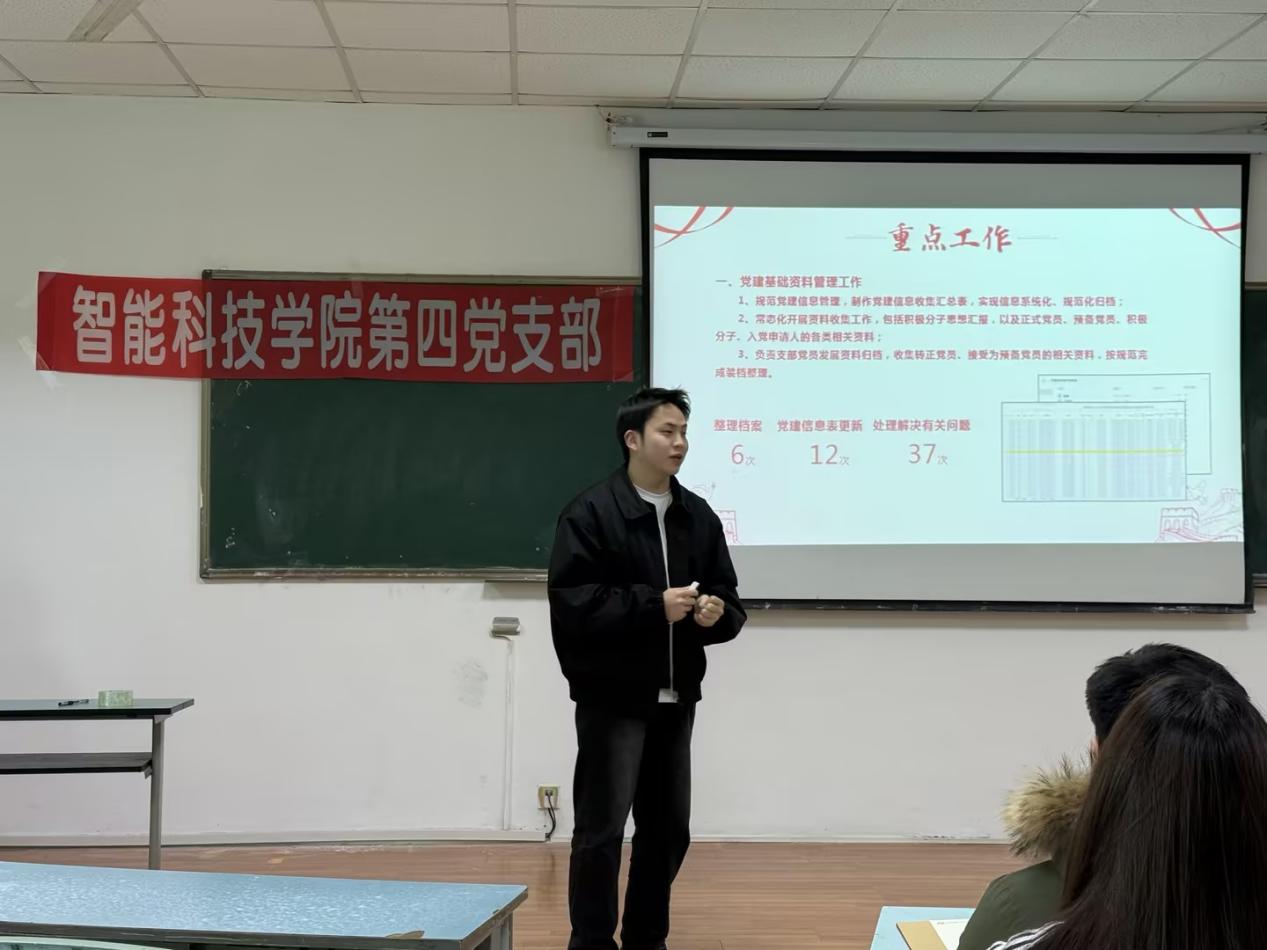 为全面检验学生干部履职成效,强化队伍建设,凝聚奋进力量,推动党建工作提质增效,1月6日,智能科技学院第四党支部在1306教室开展学生干部述职大会。学院第四党支部书记吴雪娇、宣传委员何旌铭、组织委员刘珂含、纪检委员黄彩霞出席会议,与第四党支部全体学生干部共同回顾学期历程,检视工作得失,展望未来工作方向。组织部部长述职会议伊始,吴雪娇发言肯定了本学期全体学生干部在支部建设、思想引领、活动组织、服务同学等方面付出的努力和取得的阶段性成果,...