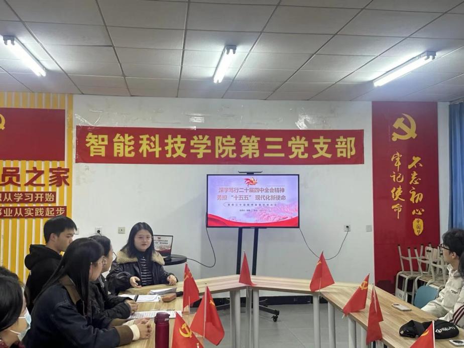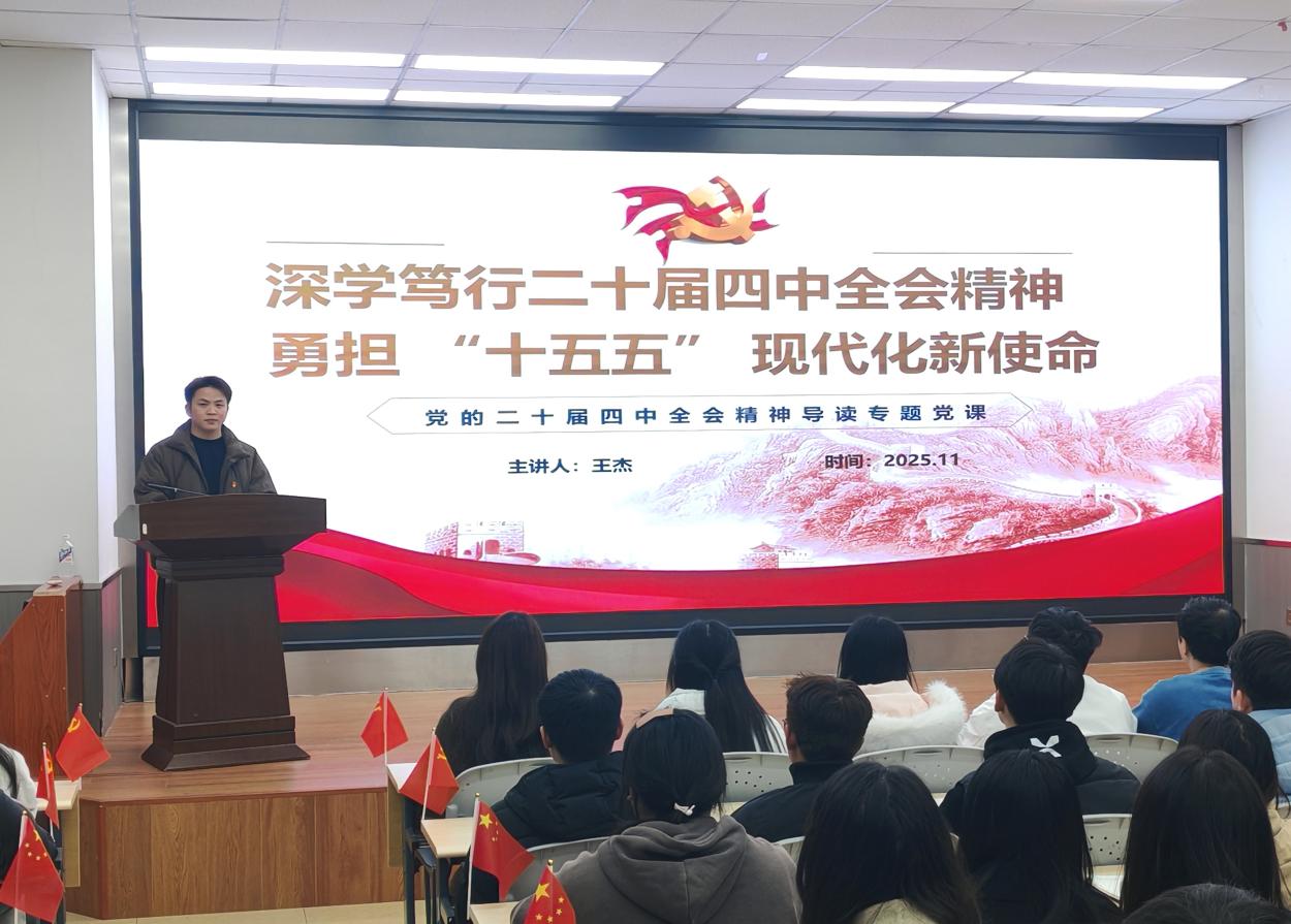 为深入学习贯彻中国共产党第二十届中央委员会第四次全体会议(以下简称“二十届四中全会”)的会议精神,引导广大学生准确把握“十五五”时期国家发展蓝图,自觉把个人成长融入中国式现代化进程,11月23日,智能科技学院第四党支部在实验楼110开展“凝心聚力启新程,踔厉奋发建新功”专题党课。此次党课由学院第四党支部组织部部长王杰主讲,学院第四党支部正式党员、预备党员、入党积极分子及部分入党申请人参加。活动现场王杰围绕“...