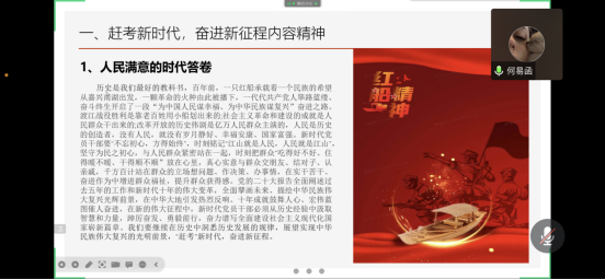 12月13日,智能科技学院第二党支部在腾讯会议开展了“赶考新时代,奋进新征程”主题分享会,党员何易函主讲,第二党支部全体学生党员、预备党员、积极分子参与学习。 内容精神本次分享会围绕着“新时代精神”“新征程事例”“赶考新时代”三个方面展开。“赶考”对于中国共产党的百年历史而言具有特殊而重要的意义,它生动展现出中国共产党矢志践行初心使命、筚路蓝缕奠基立业、创造辉煌开辟未来的奋斗姿态。何易函向同学们强...