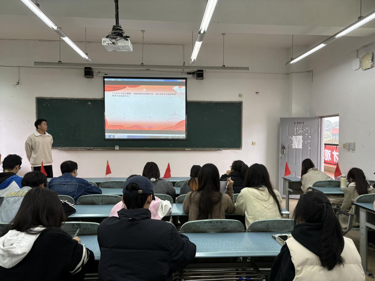 为深入学习贯彻党的二十届四中全会精神,引导大学生在“十五五”开局关键期找准时代坐标、践行使命担当,10月30日在1404教室,智能科技学院第三党支部开展“学思践悟全会精神,砥砺奋进‘十五五’新征程”主题党课。此次活动由苏文锋主讲,支部全体学生党员及入党积极分子参加。苏文锋主讲苏文锋围绕“二十届四中全会概况”“二十届四中全会核心精神”“大学生践行全会精神”“行动延伸”四个板块展开讲解,详细介绍了二十届四中全会的定位以及会议中提出的五大改革部署等内容。...