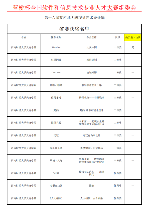 近日,第十六届“蓝桥杯”全国软件和信息技术专业人才大赛省赛圆满落幕,本届大赛吸引了来自北京大学、清华大学、复旦大学等1900余所高校的23万名选手参赛。西南财经大学天府学院积极组织学生参与,参赛学生在省赛中斩获一等奖1项、二等奖10项、三等奖32项的优异成绩,获奖总数创历史新高。其中,数字媒体专业Tianfer团队凭借出色的表现,荣获设计赛海报设计赛道一等奖,成功晋级全国总决赛。