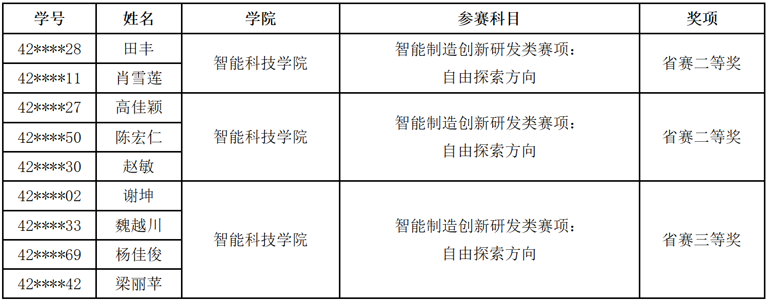 本次获奖的参赛队伍主要来自智能制造创新研发类赛项自由探索方向,参赛学生凭借扎实的专业知识、过硬的实践能力以及出色的团队协作精神,在比赛中脱颖而出。获奖同学们不仅展现了良好的专业素养,更体现了学院在推动学科发展、培养应用型人才方面的持续努力。