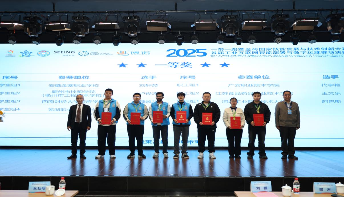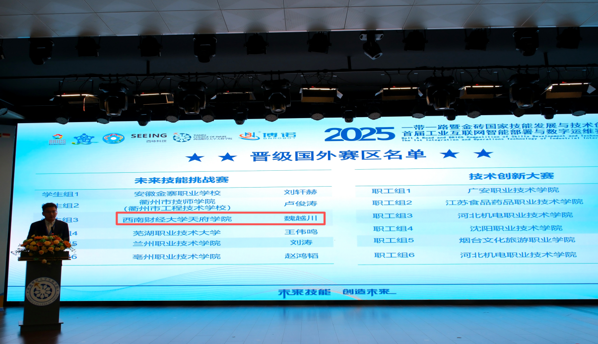 11月7日至10日,2025一带一路暨金砖国家技能发展与技术创新大赛首届工业互联网智能部署与数字运维赛项决赛在西南财经大学天府学院成功举办。智能科技学院老师黄毅、黄敏,学生魏越川、李朝俊等4人组成的西南财经大学天府学院代表队参赛,并获得了优异成绩。