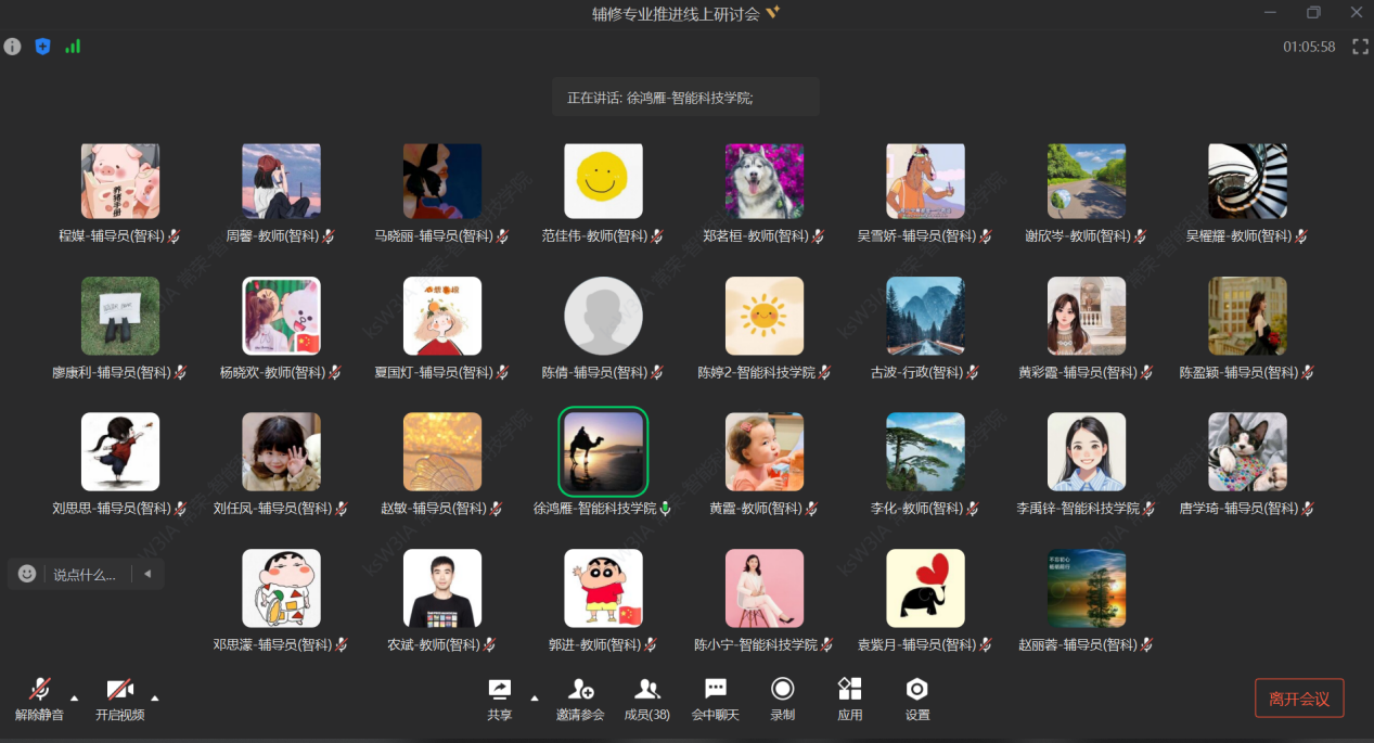 为贯彻落实学校关于复合型人才培养的工作要求,进一步推进学院辅修/微专业建设,8月5日晚上,智能科技学院召开辅修专业推进线上研讨会。此次会议由学院分党委书记常荣主持,学院院长徐鸿雁、副院长陈婷和陈小宁、分党委副书记李禹锌、系部主任、数字媒体技术辅修专业负责人和行课相关老师、全体辅导员参加。