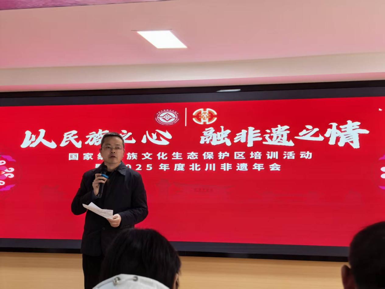 为积极推动文化自信,总结回顾2025年羌族文化系统的活态传承,2026年1月16日,在北川县文化旅游局和非遗协会的牵头下,以“民族之心,融非遗之情”为主题的国家级羌族文化生态保护区培训活动暨2025年度北川非遗年会在北川苔子茶文化展示中心盛大举行。此次盛会吸引了绵阳市非遗领域的诸多专家、学者和北川羌族自治县220多位传承人的参与,共同探讨和传承羌族文化的独特魅力。智能科技学院分党委书记、四川传统文化研究中心副主任常荣,智能科技学院第三党支部书记刘思思受邀出席了本次活动。