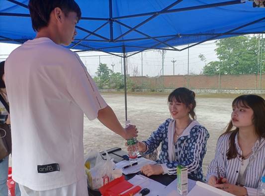 小帐篷,大关怀。团总支、学生会体育部学生干部在学院“爱心服务点”上合理分工,为需要帮助的运动员们提供物资帮助,帐篷不仅为运动员们提供休息场所,也为运动员们送上爱心与关怀。