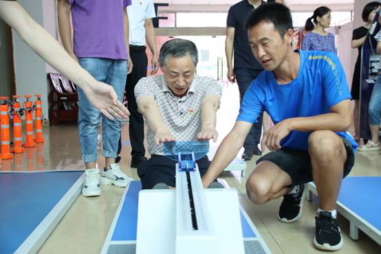 随后,校领导依次了解并亲自体验了坐位体前屈、仰卧起坐、立定跳远、身高体重、短跑、肺活量等多个项目的测试原理及测试过程,对每个项目都给予了高度认可与赞扬。