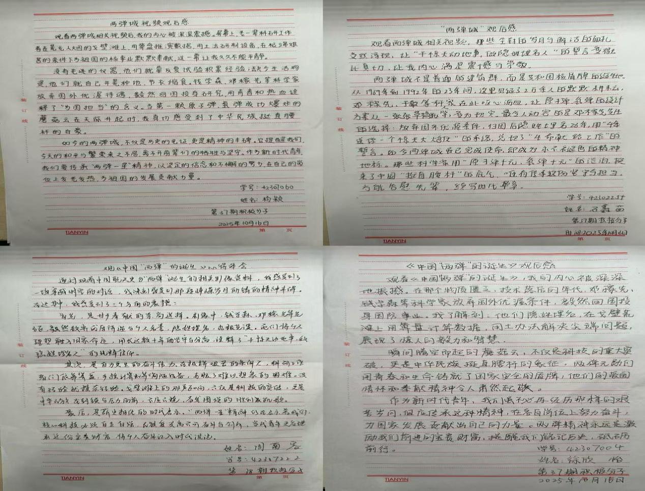 活动伊始,支部组织成员参观“两弹”历史主题展板,展板通过文字、图片等形式,系统呈现“两弹”研制的时代背景、关键历程与重要人物事迹。随后,全体成员观看纪录片《中国“两弹”的诞生》,影片以史料为基础,还原了新中国成立初期科研工作者在艰苦条件下隐姓埋名、攻克技术难关,最终成功研制原子弹与氢弹的过程。观看结束后,大家撰写学习心得,梳理活动收获与认知感悟。