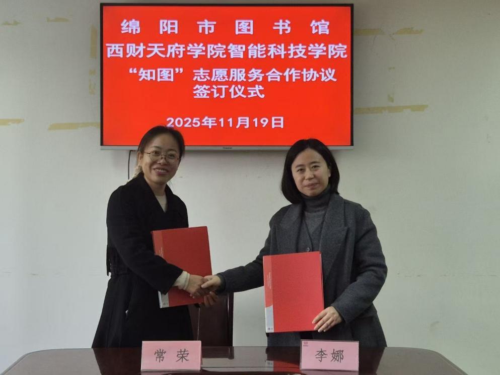 为深入学习贯彻习近平新时代中国特色社会主义思想,落实立德树人根本任务,推动党建与志愿服务深度融合,11月19日,智能科技学院第三党支部与绵阳市图书馆正式签订共建“知图”志愿服务合作协议。学院分党委书记常荣、绵阳市图书馆馆长李娜、学院第三党支部书记刘思思及双方代表出席仪式,共同见证校馆合作、志愿同行的重要时刻。