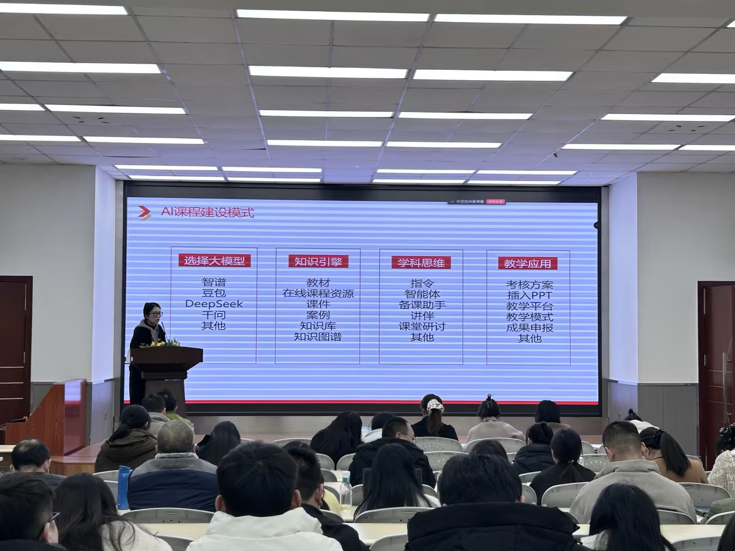 针对教育教学改革,谢卫婷老师就“高校教师AI赋能教学能力提升”进行了深入讲解,分析了人工智能技术在教学中的应用前景。她结合实际案例,分享了在构建AI智慧课程过程中,智能备课助手的应用、教学改革的创新以及应用数据的积累对于课程申报的关键作用,助力学院教师提升现代化教学水平。