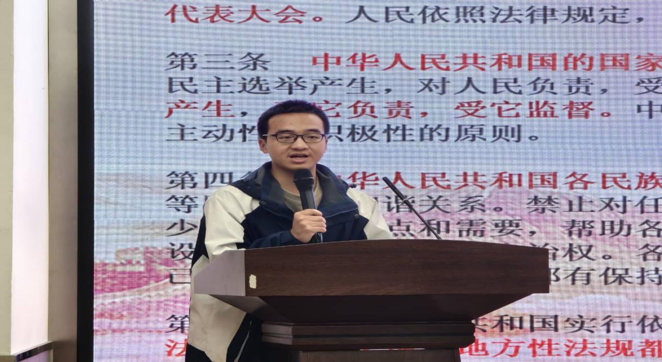 为深入学习,落实国家关于法治宣传教育和爱国主义教育的相关要求,强化全体公民的宪法意识,营造尊崇宪法、学习宪法、遵守宪法、维护宪法、运用宪法的浓厚氛围,12月4日晚上在实验楼110,智能科技学院第四党支部开展“传承红色基因,弘扬宪法精神”主题教育学习活动。本次活动由学院第四党支部宣传部部长陈智勇主讲,第四党支部正式党员、预备党员、部分入党积极分子以及入党申请人共同参加。