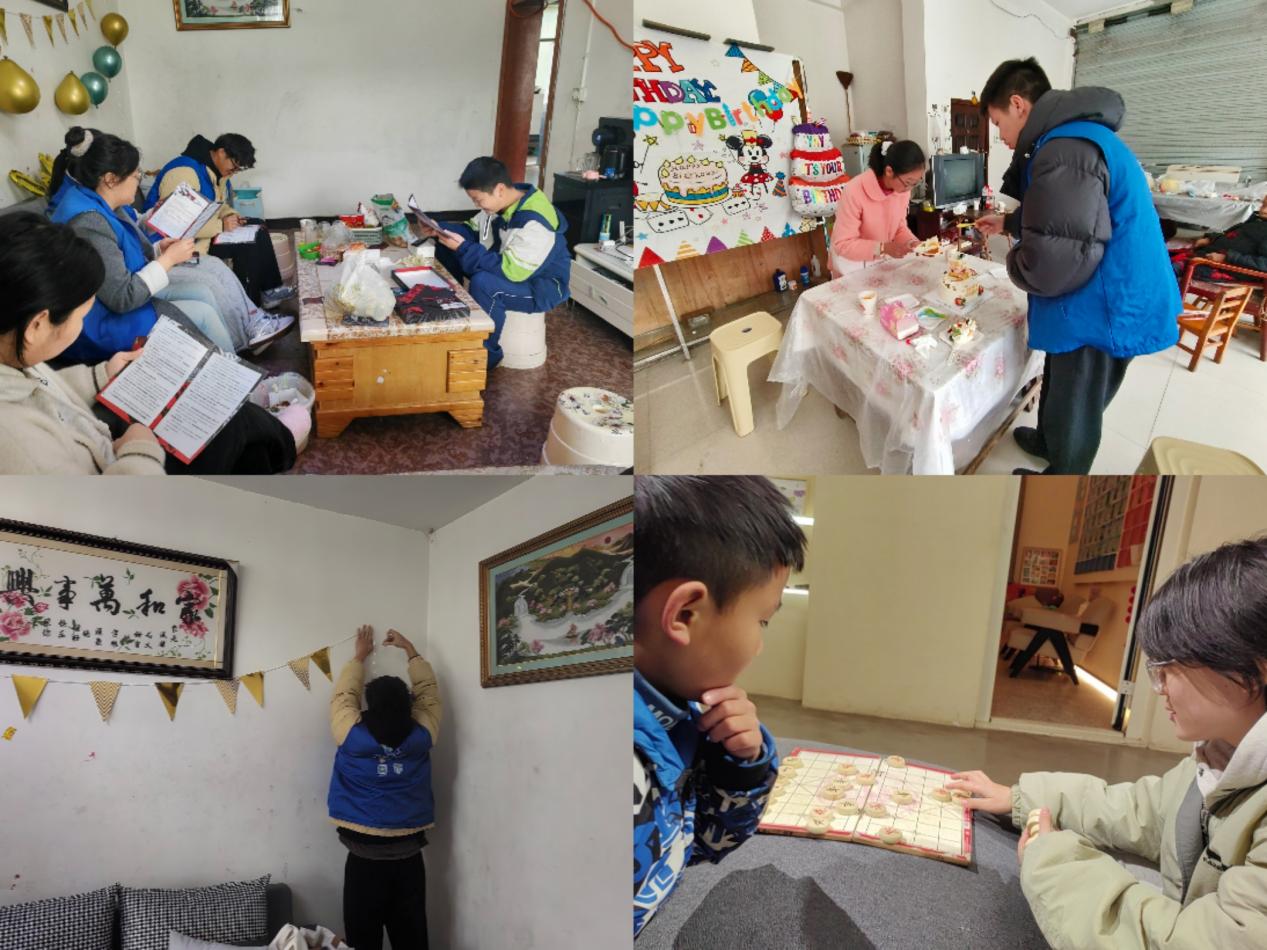 随后,生日的温馨悄然融入这片暖意之中。志愿者与孩子们一起布置房间,有人踩着小凳张贴彩色横幅,有人追着飘起的气球递上胶带,待“Happy Birthday”的字样亮起,清亮的生日歌便充盈了整个房间。孩子们闭眼许愿时,沾着甜奶油的蛋糕悄悄递到手边,盈盈笑脸与摇曳烛光交映,成为这一天最柔软的定格。志愿者或与孩子围坐对弈,或并肩共读绘本,每一次俯身、每一个笑眼,都浸润着真诚的关怀,将温暖守护的意义悄然诠释。