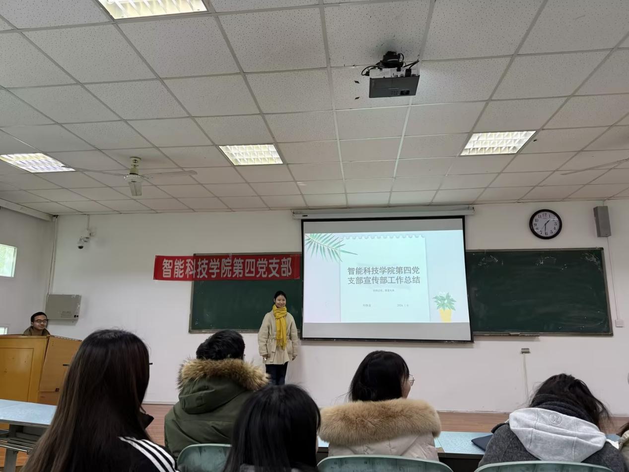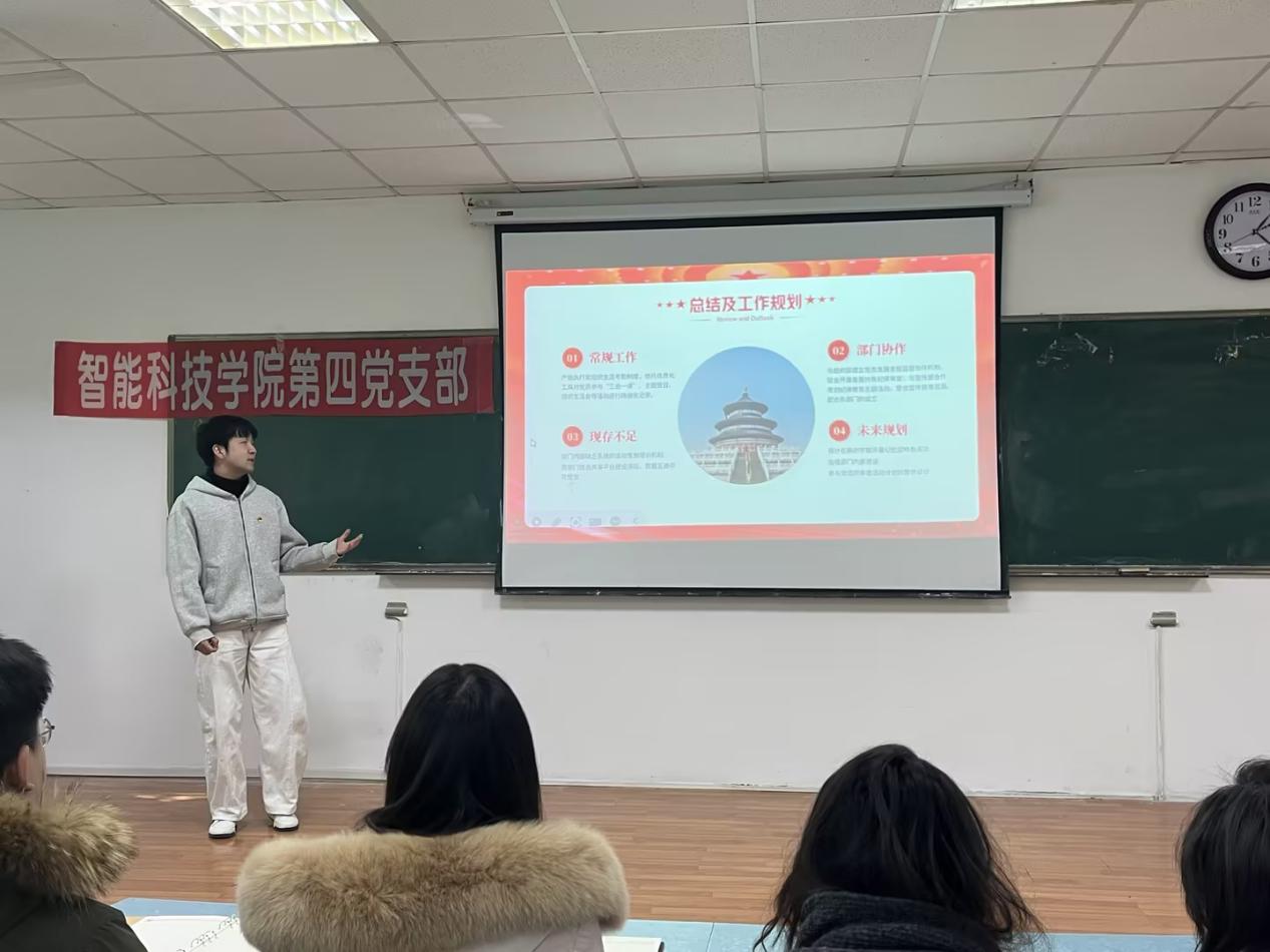 为全面检验学生干部履职成效,强化队伍建设,凝聚奋进力量,推动党建工作提质增效,1月6日,智能科技学院第四党支部在1306教室开展学生干部述职大会。学院第四党支部书记吴雪娇、宣传委员何旌铭、组织委员刘珂含、纪检委员黄彩霞出席会议,与第四党支部全体学生干部共同回顾学期历程,检视工作得失,展望未来工作方向。