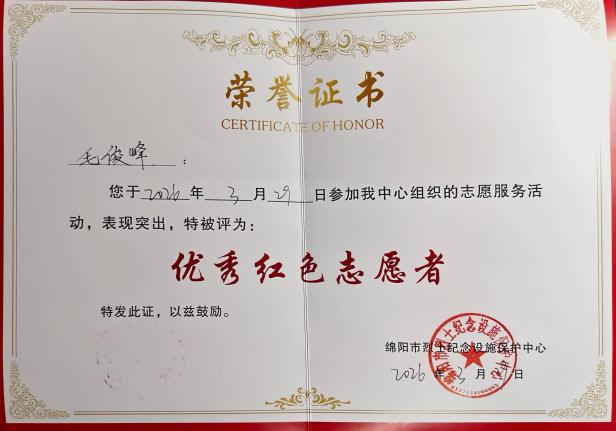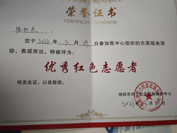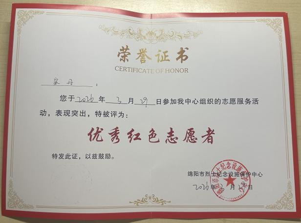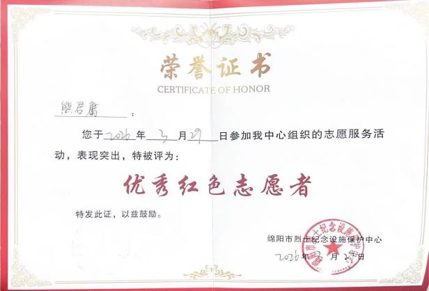 志愿者获得“优秀红色志愿者”证书