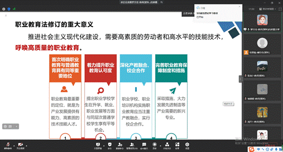 首先,罗文佳领学《中华人民共和国职业教育法》。她主要介绍了职业教育概况、职业教育发展状况、职业教育法内容、修订前后对照,阐释了职业教育法修订的重大意义,指出了职业教育法修改带来的影响和面临的困难。通过切实学习将思想和行动统一到习近平总书记关于职业教育的重要论述和党中央、国务院决策部署上来,不断提高全体教职工政治判断力、政治领悟力、政治执行力,全面、准确宣传解读职业教育法内容,牢牢把握正确政治方向和舆论导向。