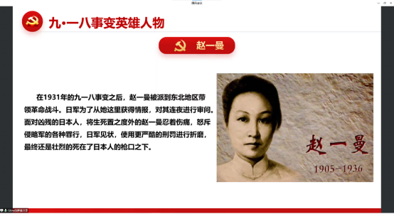 龚玲苇首先为大家介绍了九一八事变的历史背景,详细讲述了九一八事变的过程。九一八事变最终结果是东北全境沦陷,此后,日本在中国东北建立了伪满洲国傀儡政权,开始了对东北人民长达14年之久的奴役和殖民统治,使东北3000多万同胞饱受亡国奴的痛苦滋味。看着同胞们饱受苦难,祖国一点点沦陷,一个个保家卫国的抗日英雄挺身而出,为国捐躯。随后龚玲苇为大家详细讲解了张占元、赵一曼等历史英雄宁死不屈、身先士卒的伟大精神。