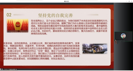 12月7日晚,智能科技学院第二党支部通过腾讯会议线上开展了“自我革新,自我完善,奋斗新征程”主题分享会,会议由严永黎和田静主持。