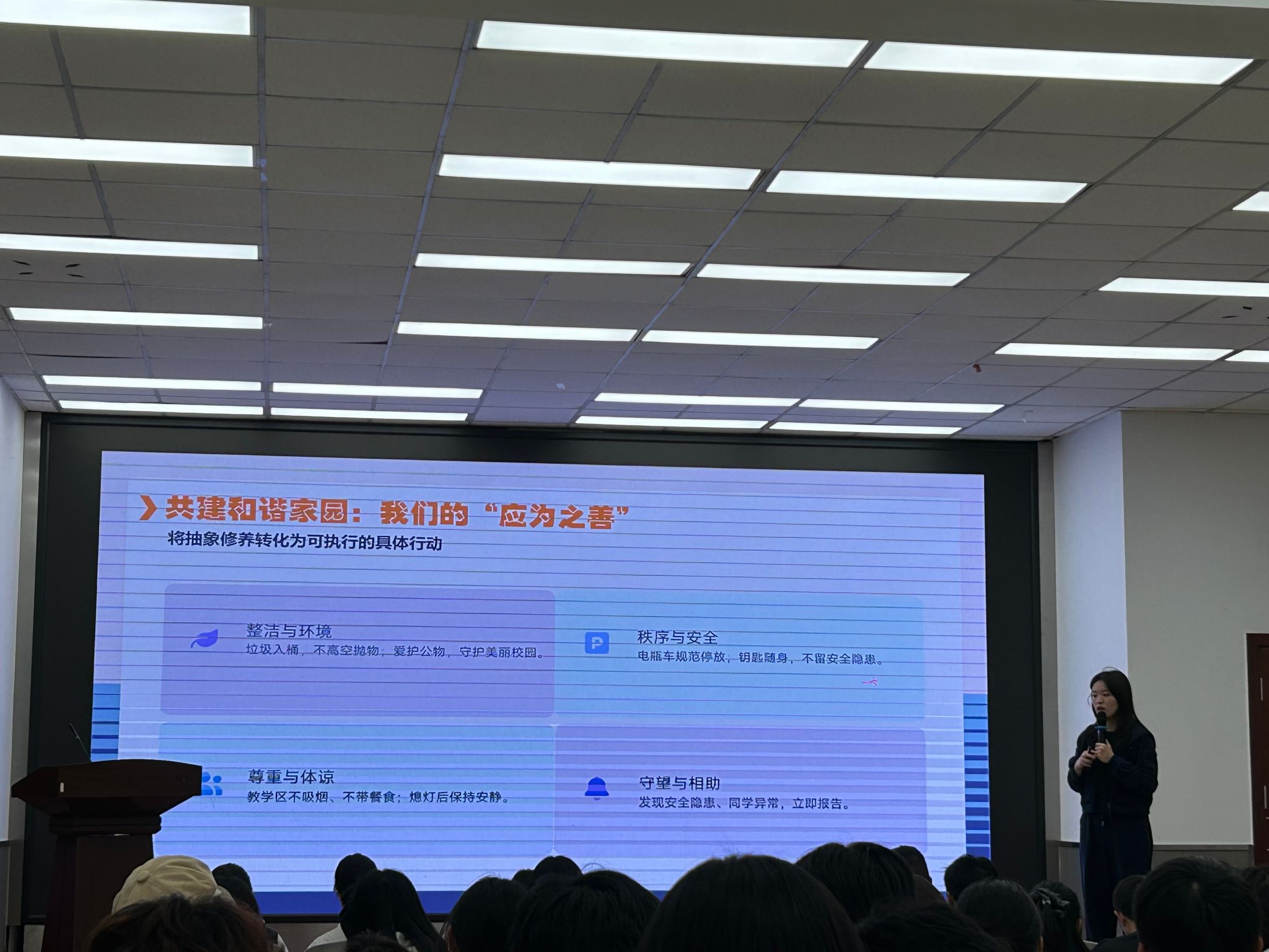 班会伊始,夏国灯以“军训记忆”为引,带领同学们复盘为期两周的军训生活。她说到,军训教会我们的不仅是标准的正步走,更是“令行禁止”的纪律意识。她在总结中强调,从叠“豆腐块”被子到按时集合列队,每一个细节都在培养大家的规则意识,而这种意识正是大学生活乃至未来人生的重要基石。接着,她结合大学生活的实际场景,从学习、生活、交往三个维度展开讲解。学习上,她强调按时上课、认真听讲、独立完成作业的重要性,避免迟到早退、抄袭作弊等不良行为;生活中,要保持宿舍整洁、合理安排作息、节约水电资源,远离熬夜沉迷游戏、乱堆乱放等陋习;交往中,应尊重他人、礼貌沟通、团结同学,学会处理人际关系中的矛盾与问题。文明习惯看似是小事,却能反映一个人的素养,更能影响大学生活的质量,只有从细节做起,才能逐步实现“止于至善”的目标。