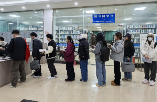 借阅过程中,大家结合计算机专业学习需求与个人兴趣偏好,在书架间挑选《数据结构与算法分析》《Python编程实战》等专业书目,还有同学围在文学与历史类书架间,特意拿出手机拍下书脊编号,向身边同学安利好书。借阅时,同学们凭借提前沟通明确的参与规则,电脑搜索、有序排队,遇到操作不熟练的同学,身边的伙伴还会主动上前帮忙指导,全程秩序井然、有条不紊。