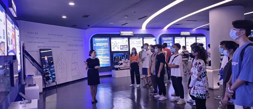 师生一行首先到达成都新经济活力区·双创服务平台,该平台位于成都高新区,是成都高新区践行新经济发展的成果展示平台。工作人员细致地向师生介绍了近年来成都新经济活力区的发展历程及在交通、通讯、医疗、游戏、电子芯片等各个领域的发展成果,并介绍了预开发的AI领域行业建设,展示了成都的发展速度与发展潜力。