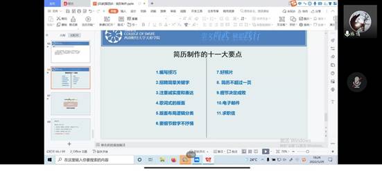 班会上,陈倩结合今年来就业形势,强调了简历制作的重要性。她强调,简历就像个人广告,个人需要通过简历展现自我价值和技能;学会制作规范的简历对于评奖评优材料编写和求职都具有十分重要的意义。为提升同学们的制作能力,她从简历的定义、求职意向、技能与实践等方面对规范制作简历进行了详细的解读,并重点讲述了简历制作的十一大要点,帮助同学们制作出彩的简历。