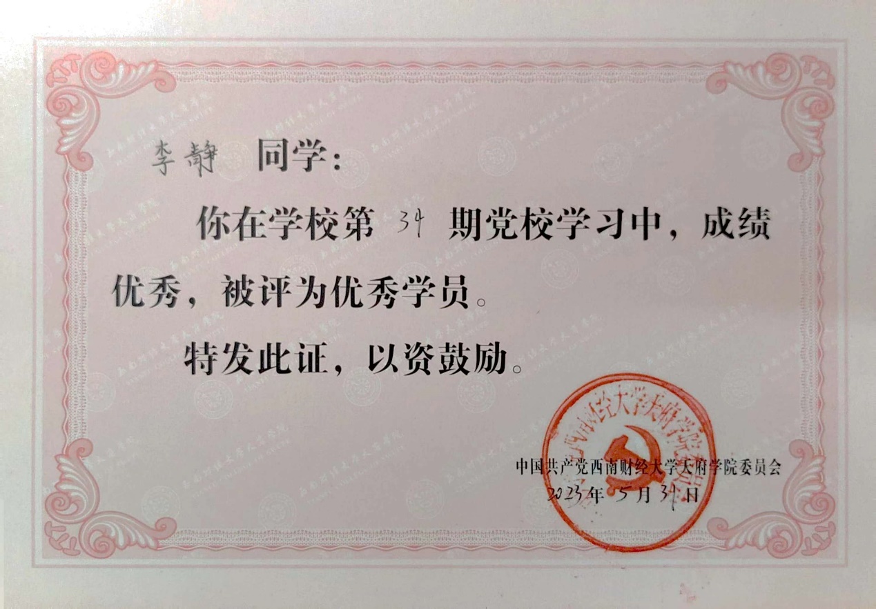 她心怀热血、乐于奉献,积极向党组织靠拢。目前已是入党积极分子,并在党校学习期间荣获优秀学员。
