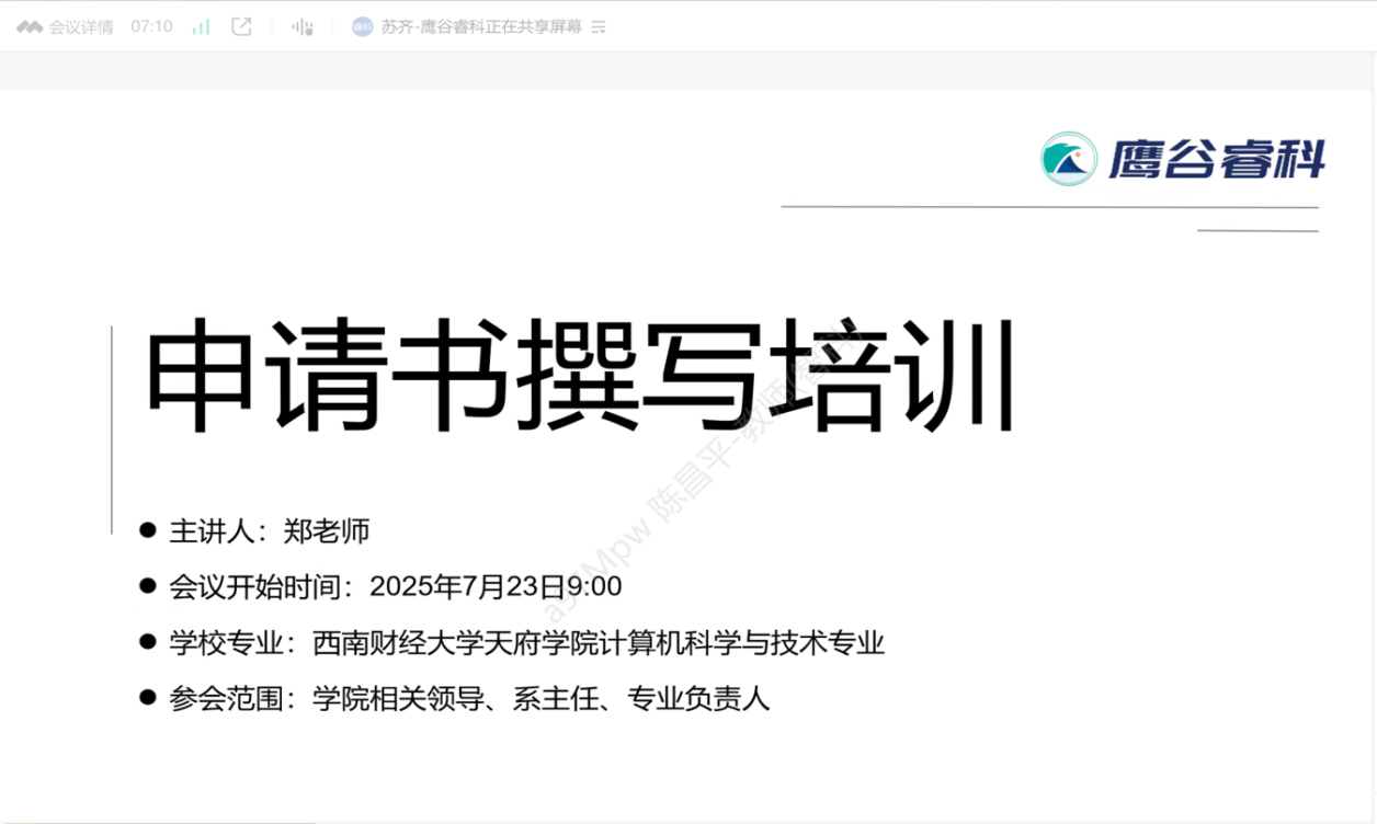 7月23日上午,智能科技学院线上开展了计算机科学与技术专业工程教育认证申请书撰写培训会议。会议特别邀请了鹰谷睿科数据科技有限公司的郑老师,为大家提供指导与培训。此次会议由鹰谷睿科的苏齐主持,参与培训的人员包括学院副院长陈小宁和陈婷、院长助理郭进和刘丹、计算机工程系主任吴櫂耀、智能应用系主任范佳伟、信息媒体系主任李化、工程认证项目负责人陈昌平以及负责认证申请材料准备的骨干教师。