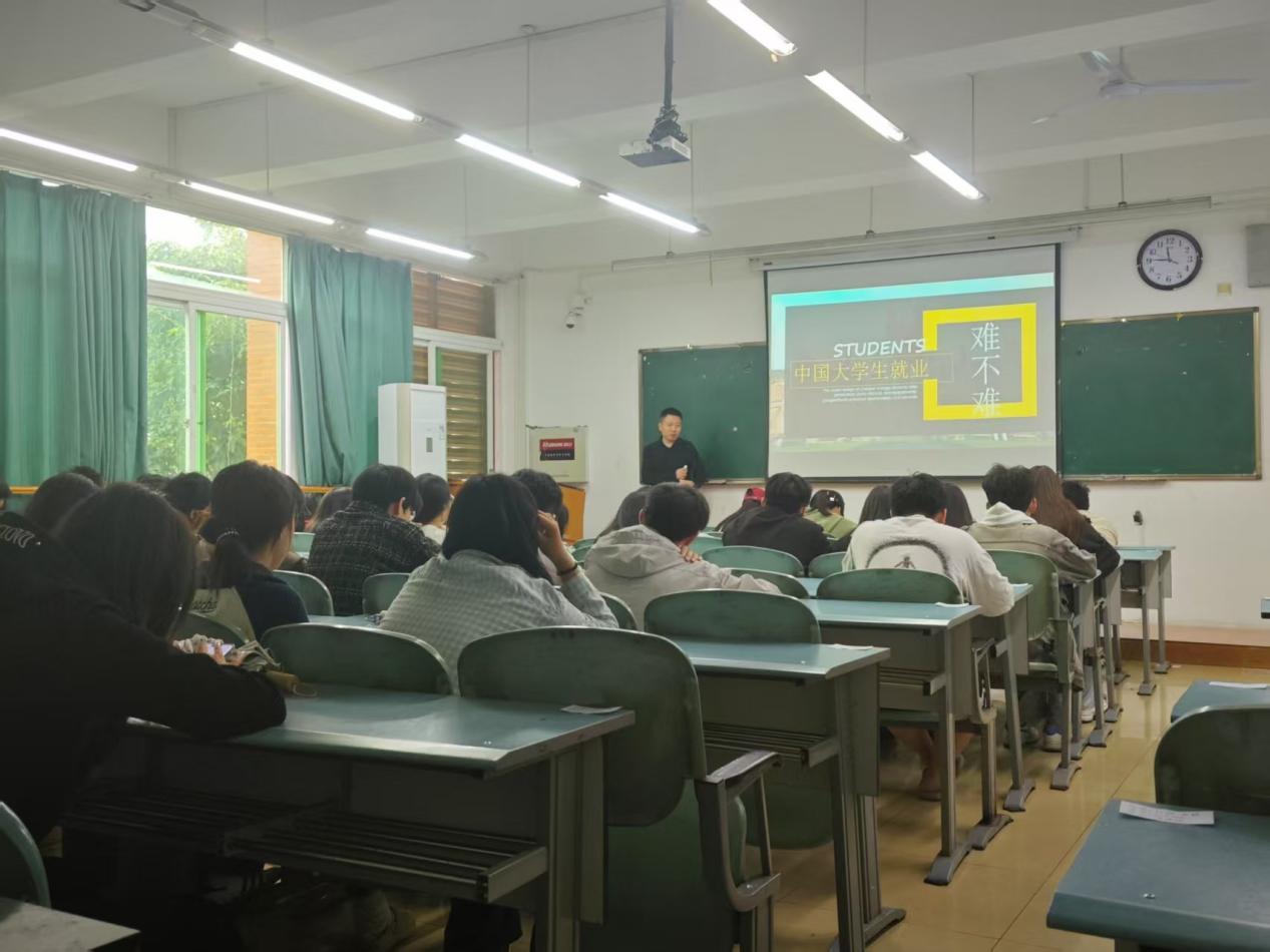 讲座伊始,主讲老师以当前大学生就业市场的整体态势为切入点,通过详实的数据和鲜活的案例,深入剖析了当下大学生就业面临的机遇与挑战。他指出,随着就业竞争的日益激烈,公职岗位凭借稳定的职业发展、完善的保障体系以及服务社会的价值属性,成为越来越多大学生的就业选择之一。同时,他结合不同专业的就业特点,为学生们梳理了多元化的就业方向,引导大家理性看待“考公热”,并鼓励学生根据自身兴趣、专业优势和职业规划,合理选择发展路径,避免盲目跟风。