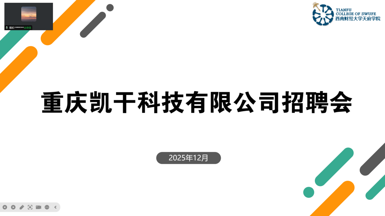 为搭建学生与企业直接交流的平台,拓宽学生就业渠道,助力学生顺利走向职场,12月30日,智能科技学院线上开展重庆凯干科技有限公司专场招聘会,学院分党委副书记李禹锌,重庆凯干科技有限公司总经理揭凯、公司人事部主管唐成豪及学院部分毕业生参加。