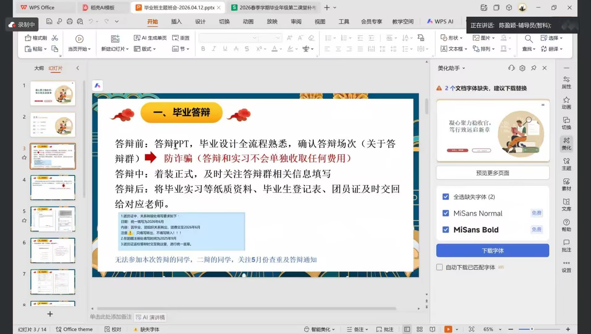 随后,在就业指导与毕业事务部署环节,陈盈颖结合当前就业市场形势,为同学们深入分析行业发展趋势与就业机遇,同时对毕业季各项重要事务进行全面部署,明确时间节点与相关要求,为毕业生顺利求职、平稳毕业提供全方位指导。