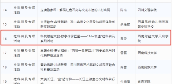 近日,四川省社会科学界联合会正式公布《关于“推进文旅深度融合发展”社科普及专项活动拟立项名单的公示》,在全省众多申报项目中,智能科技学院分党委书记、四川传统文化研究中心副主任常荣团队申报的《科技赋能文旅・数字传承巴蜀——“AI+非遗”社科普及系列活动》成功立项,为学院社科普及与科研创新工作奠定了一定的基础。公示截图此次获批的“AI+非遗”社科普及项目,精准对接国家与地方文化发展战略需求。项目紧紧围绕党的二十大“...