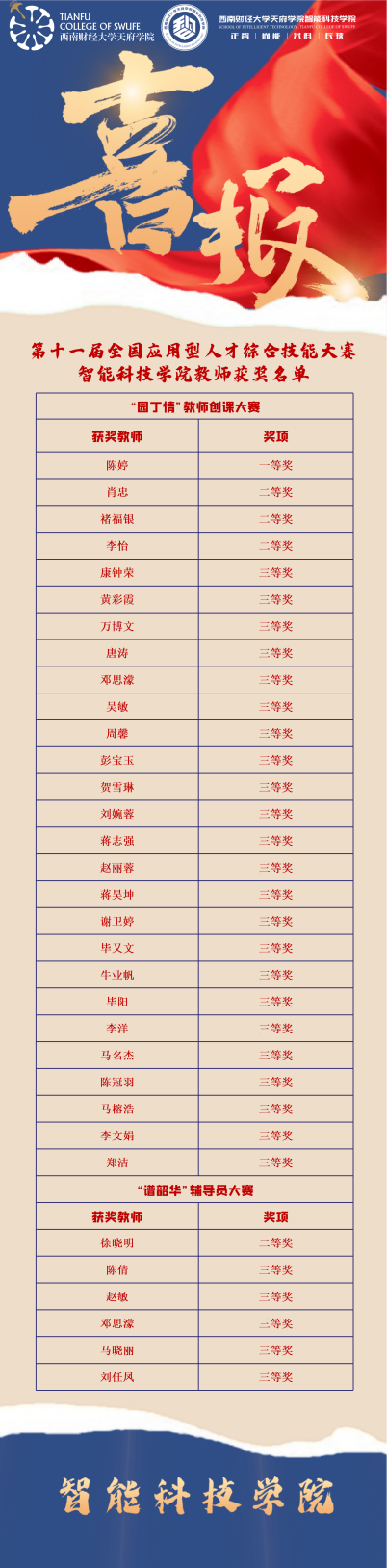 12月18日,第十一届全国应用型人才综合技能大赛圆满落幕。本届大赛以“数智赋能,创赢未来”为主题,吸引了全国878所高校、18762支队伍参赛,涵盖数字艺术、智能制造、职业规划等多个领域,展现了应用型人才培养的丰硕成果。在激烈的角逐中,智能科技学院教师团队凭借卓越的教学创新与实践能力,脱颖而出,荣获大赛重要奖项,为学院争得荣誉。获奖喜报大赛自启动以来,秉持“以赛促学、以赛促创、以赛促教、以赛促业”的理念,...
