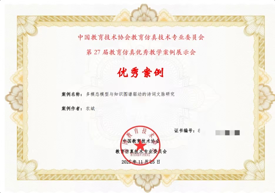 近日,中国教育技术协会教育仿真技术专业委员会第27届教育仿真优秀教学案例展示会传来喜讯,智能科技学院教师农斌的《多模态模型与知识图谱驱动的诗词文脉研究》教学案例,凭借创新性技术融合与突出教学实践价值,荣获“优秀案例”荣誉。获奖证书该案例聚焦诗词文脉研究,深度融合数字媒体技术,以多模态模型整合文本、图像等多元数据,借知识图谱梳理诗词知识关联,为传统诗词教学注入科技活力。助力学生突破时空限制,沉浸式理解诗词脉络与文化传承,...