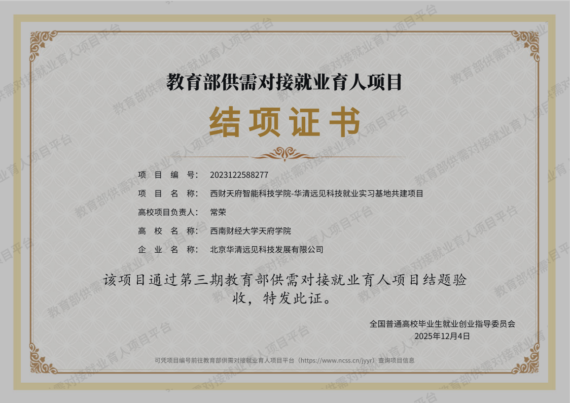 近日,第三期教育部供需对接就业育人项目评审结果揭晓,智能科技学院分党委书记常荣申报的《西财天府智能科技学院—华清远见科技就业实习基地共建项目》项目按照研究计划,逐步开展项目研究,提交结项材料,顺利通过评审完成结项。项目结项证书此次顺利结项,是对项目建设成效的充分肯定,更是学院深化就业育人改革的新起点。未来,学院将持续巩固项目成果,深化与各用人单位的战略合作,不断完善供需对接、协同育人机制,着力培养更多适应行业发展需求的高素质应用型人才,...